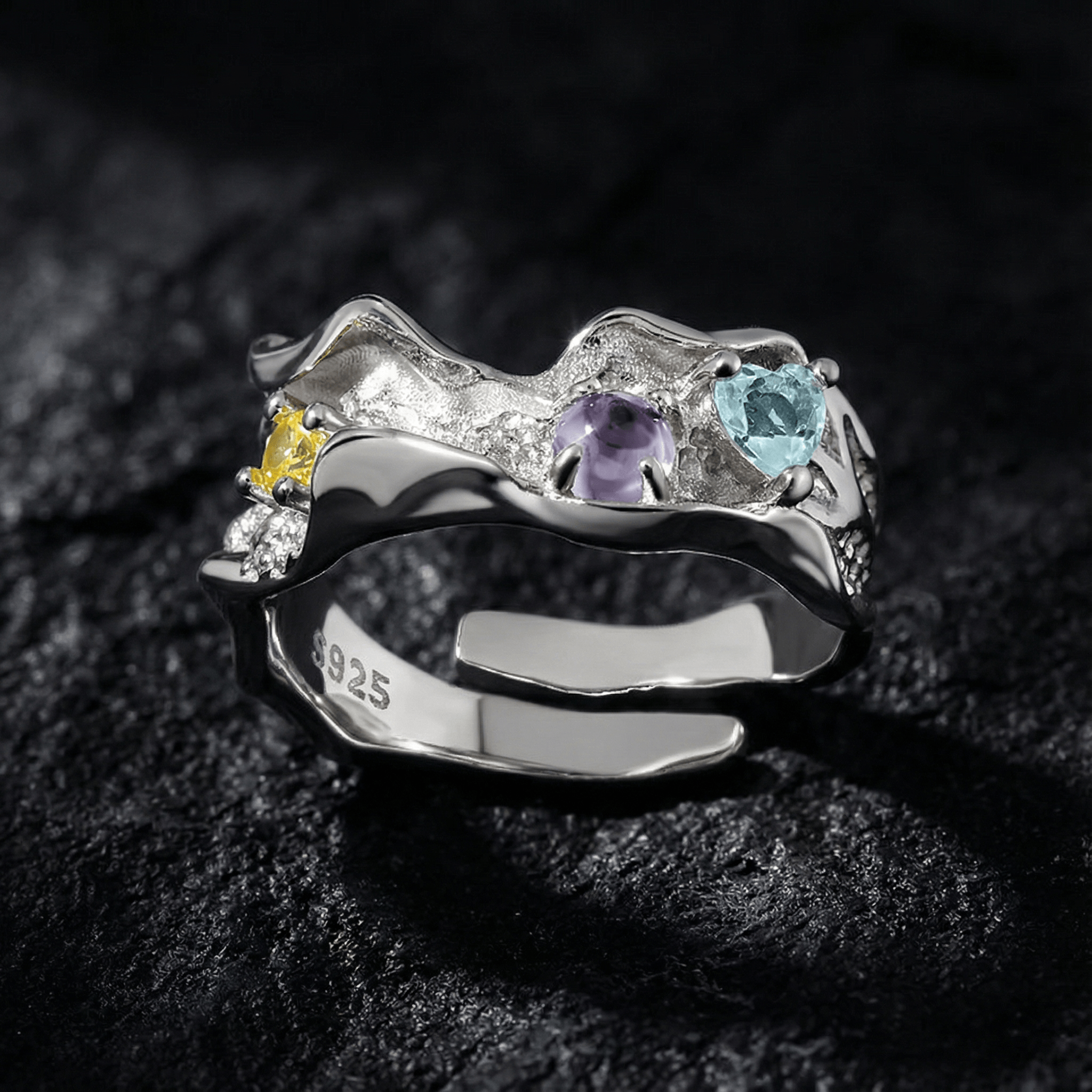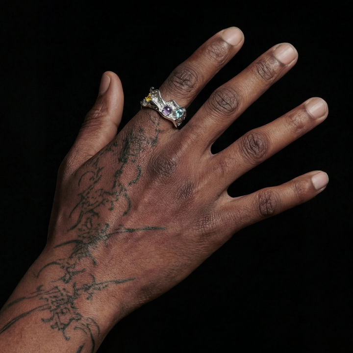 Curated Chrome Aurora Crest ring with a sculptural open band and multicolor crystal gemstone accents. A layered, expressive piece designed with an adjustable fit for everyday wear or special occasions.