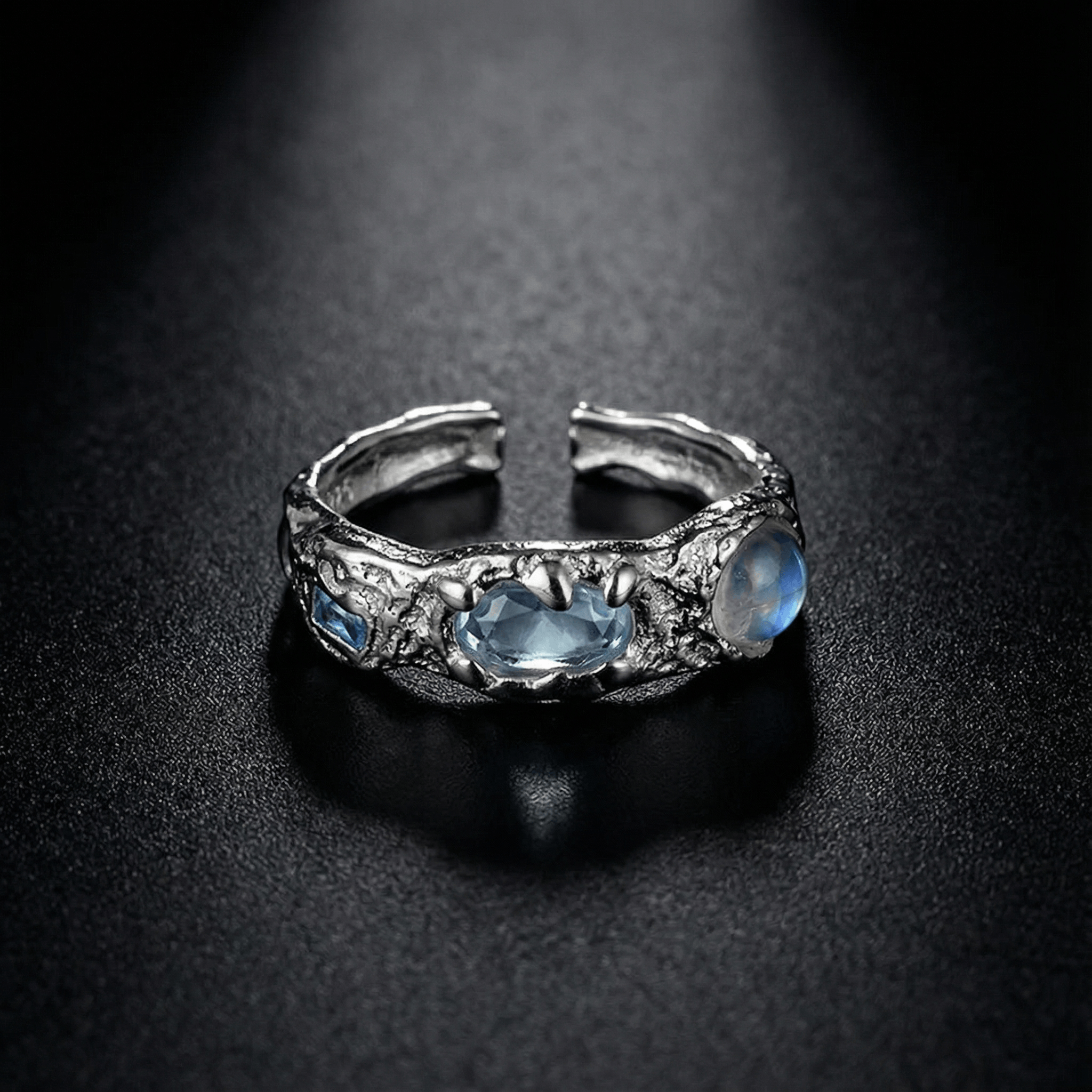 Curated Chrome Azure Echo ring with a luminous blue stone set in a rugged, sculptural band. A bold, versatile piece designed with an open-band fit for everyday wear, stacking, or statement styling.