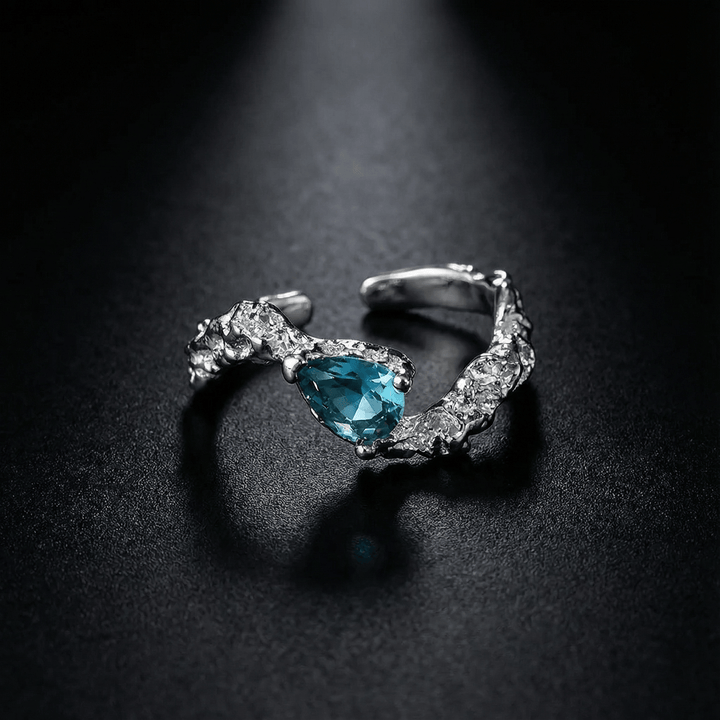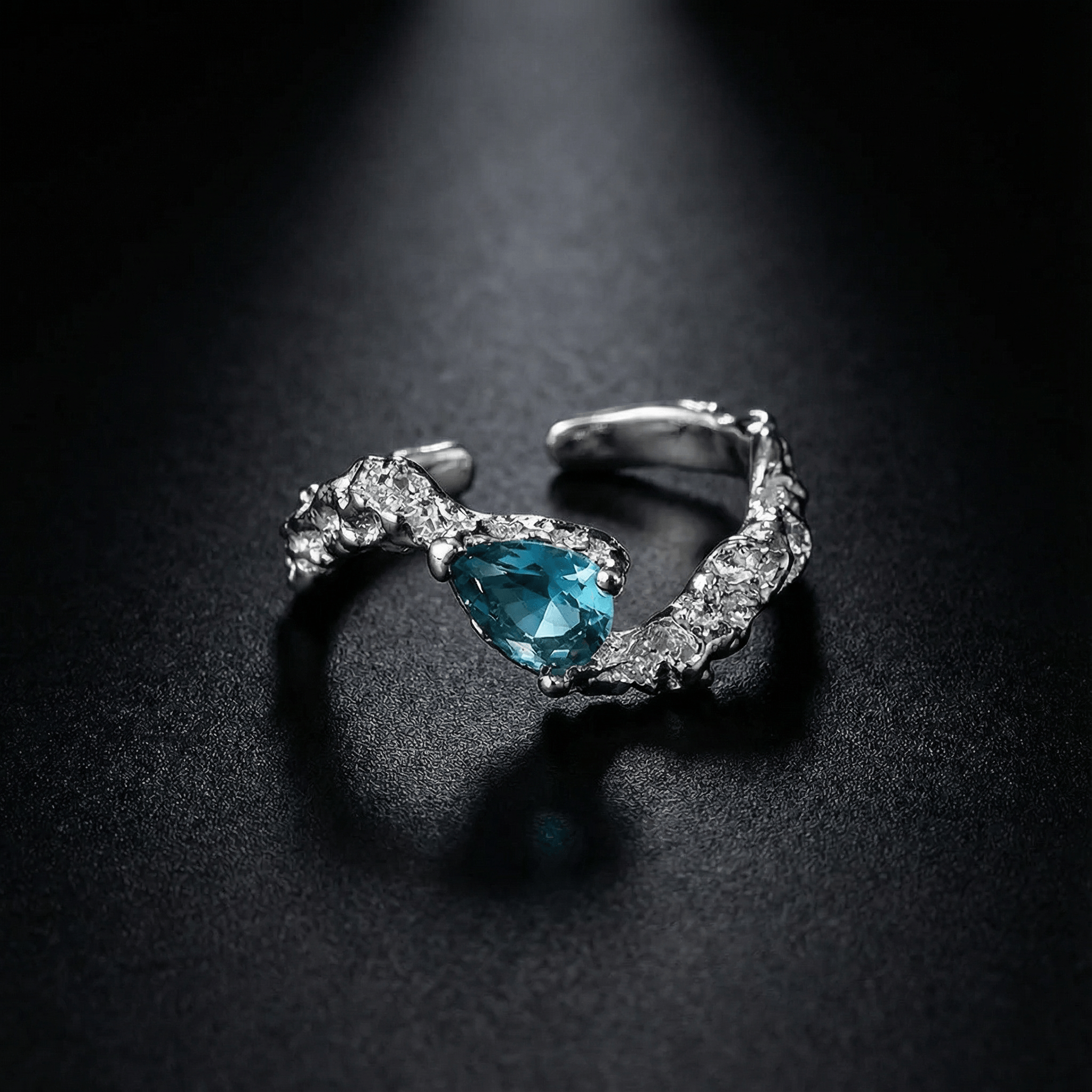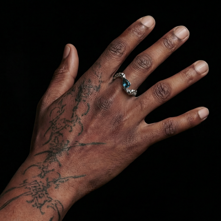 Curated Chrome Azure Relic ring with an egg-shaped cubic zirconia set in an organically sculpted band. A bold, sculptural piece designed with an open-ring fit for everyday wear or statement styling.