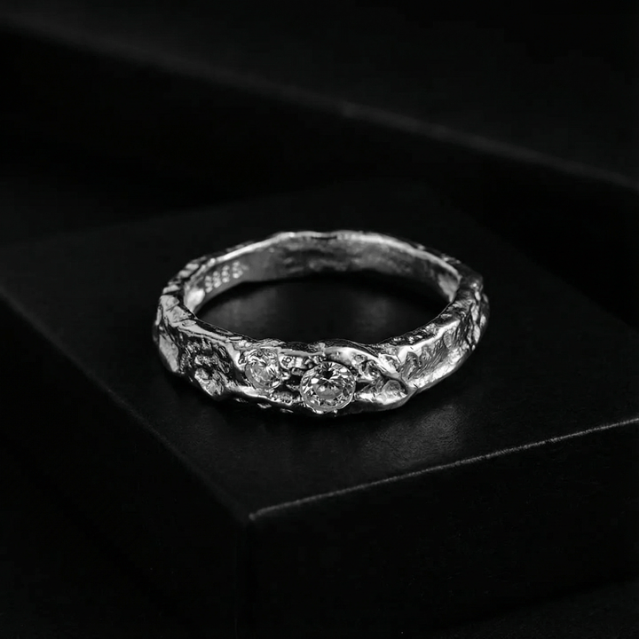 Curated Chrome Riptide ring with an irregular, foil-textured band that captures motion and light. A sculptural, industrial-inspired piece.