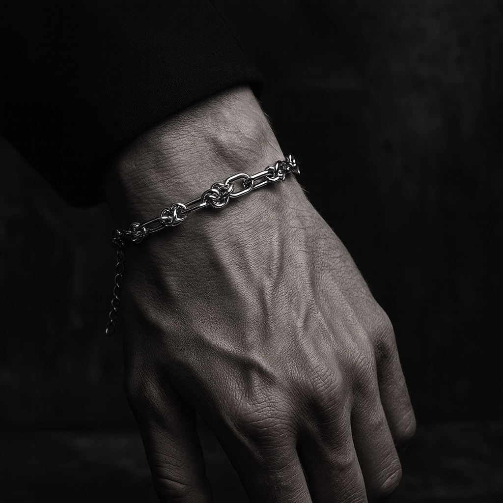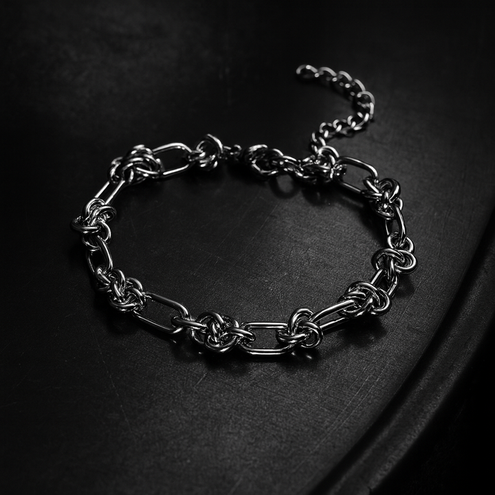 Bold and refined, the Eclipse Knot Bracelet is a statement piece that merges urban edge with timeless craftsmanship. Designed with interwoven knotted links in a rope-chain style, it exudes strength, sophistication, and modern appeal.