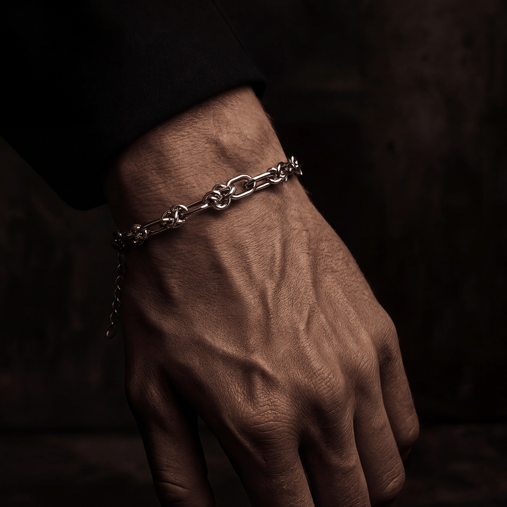 Curated Chrome Eclipse Knot bracelet with interwoven knotted links in a rope-chain design. A bold, sculptural piece built for everyday wear or standout styling.