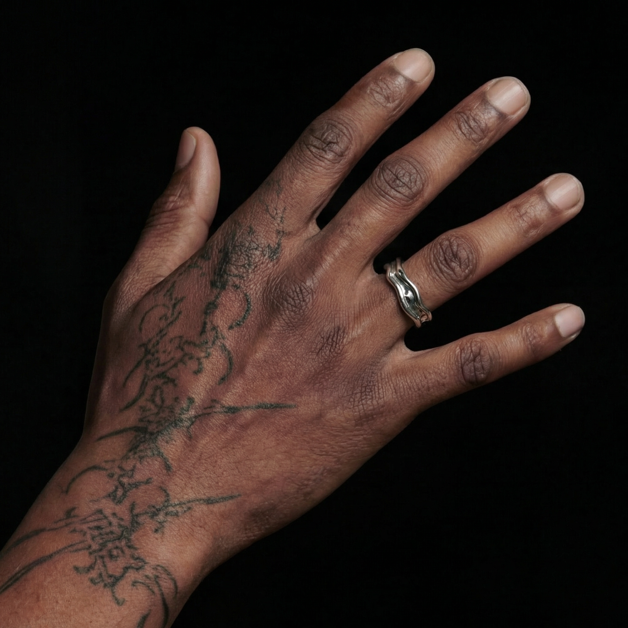Curated Chrome Liquid ring with a fluid, wave-inspired band. A sculptural, modern piece designed with an open-band fit for everyday wear or statement styling.