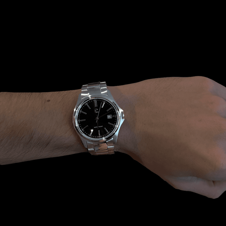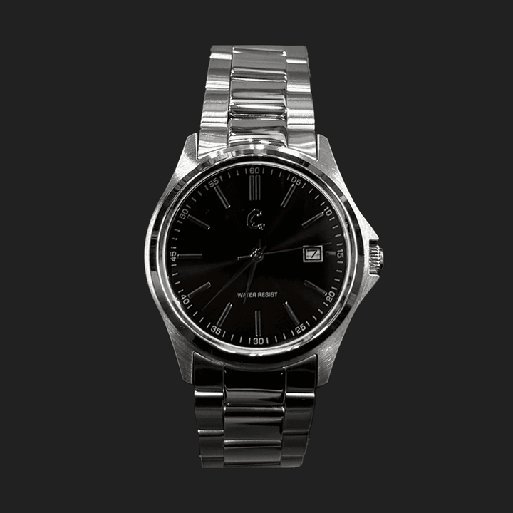 Redefine sophistication with the Curated Chrome Obsidian. Featuring a captivating black sunburst dial, scratch-resistant sapphire glass, and 50-meter water resistance, this timepiece embodies sleek, understated elegance. Crafted with a polished stainless steel case and bracelet, it combines durability with refined finishing touches, including engraved details on the clasp and case back. Powered by precise Japanese Quartz Movement, the Obsidian is the ultimate expression of modern style and reliability.