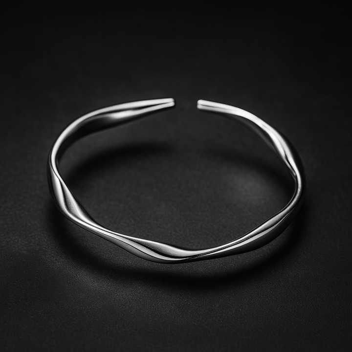 The Twistline Bracelet is a sleek unisex accessory that unites timeless minimalism with modern design. Featuring a gracefully twisted silhouette, this open cuff reflects light with subtle elegance, creating a refined, sculptural look that complements any style.